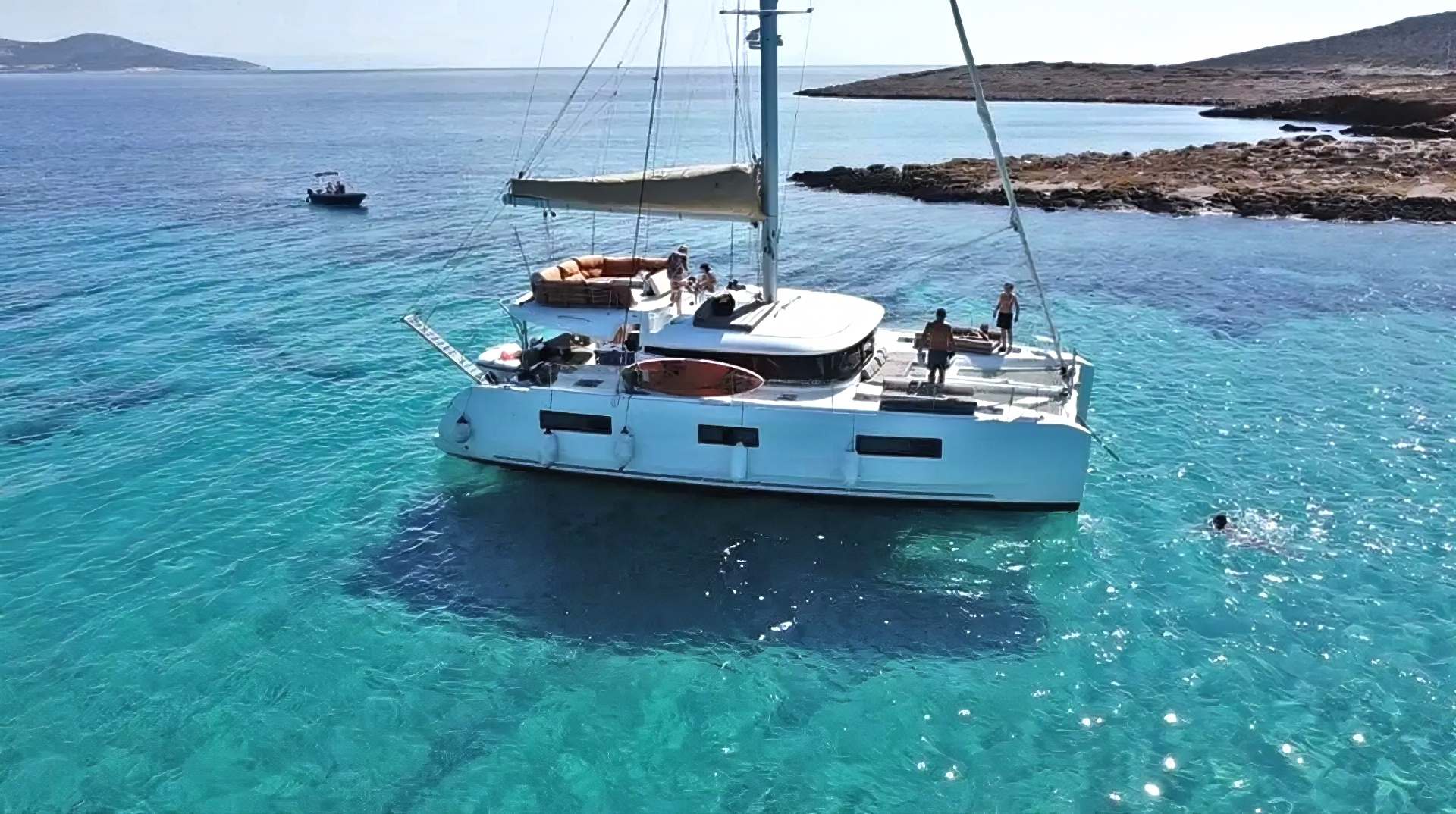 A white catamaran with several people onboard floats on clear blue water near a rocky coastline under a sunny sky, offering an unforgettable experience with Paros Boat Tours.