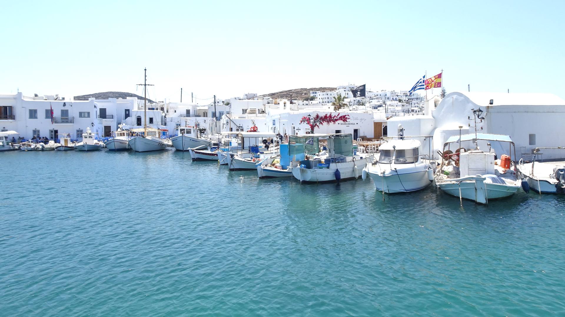 Fishing boats docked along Naoussa marina, Paros, with white buildings and Greek flags in the background under a clear blue sky, capture the charm of Paros Boat Tours.