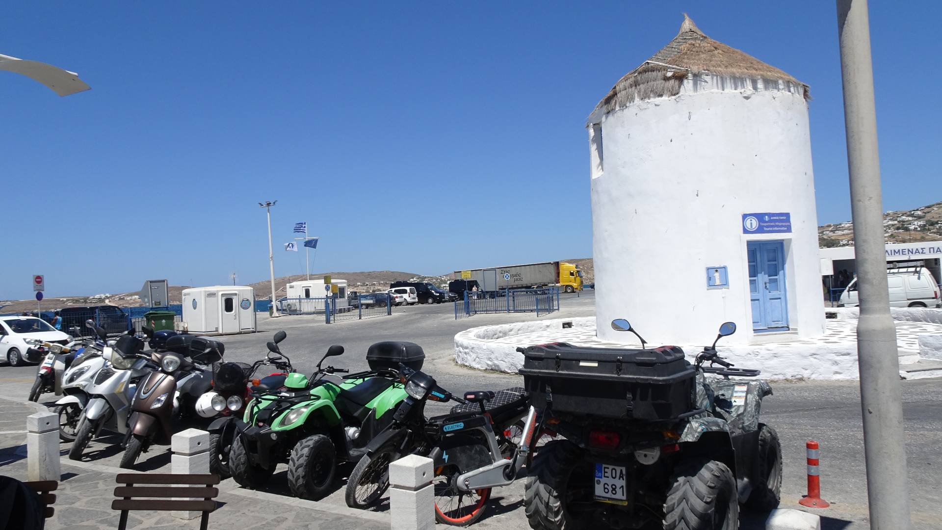 Several motorbikes and ATVs are parked in front of a small white cylindrical building with a conical thatched roof at Parikia Port area, where Paros Boat Tours begin under a clear blue sky.