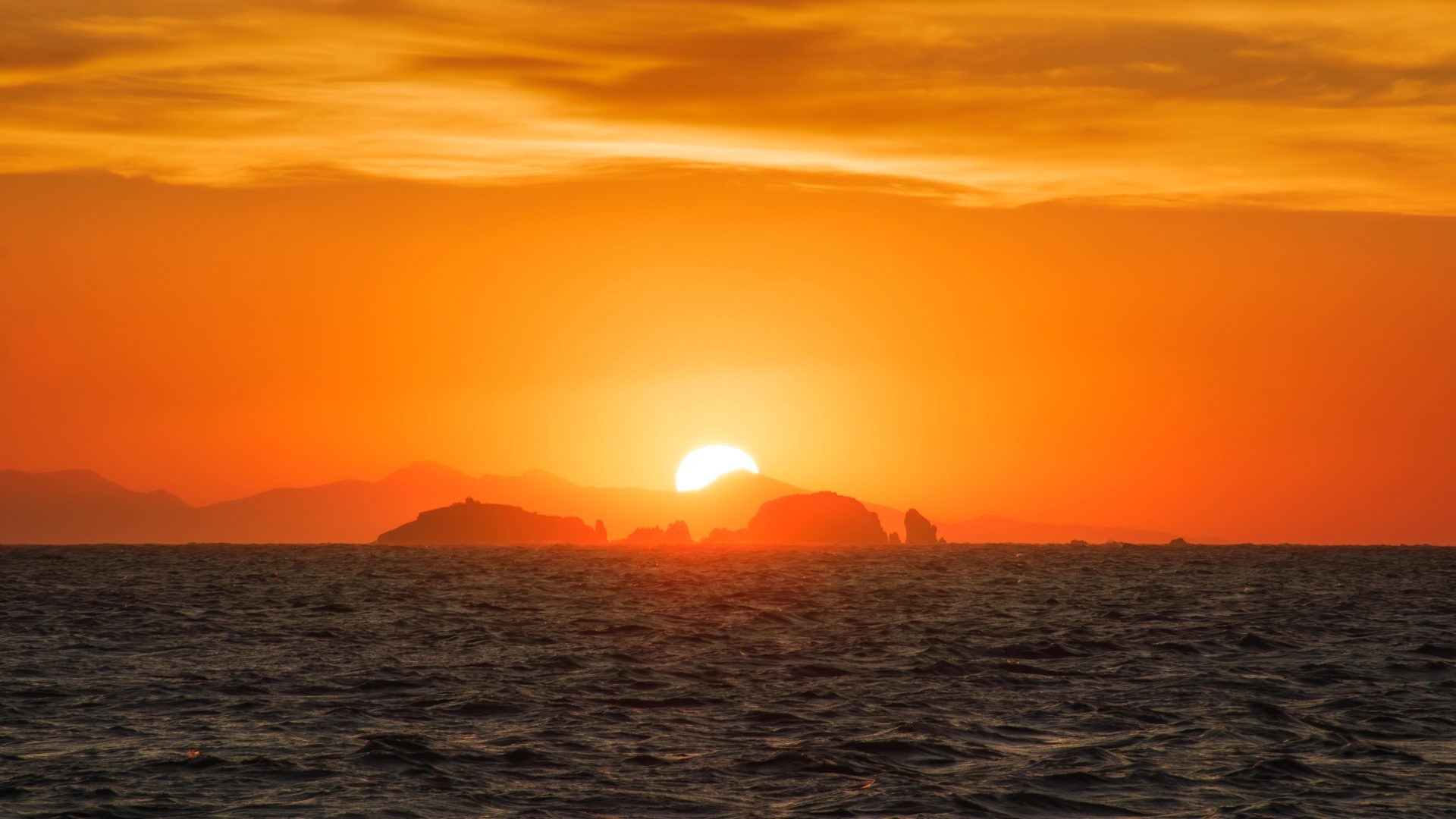 The sun sets behind distant islands, casting orange and yellow hues across the sky above a dark, rippling sea—an unforgettable scene often admired on Paros Boat Tours.